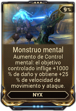 ![]() | ![]() ENERGÍA 25 TECLA 1 | Control mental Nyx invade la psique de un objetivo, confundiendo a los enemigos y haciéndolos luchar por la causa tenno. | Fuerza:N/A |